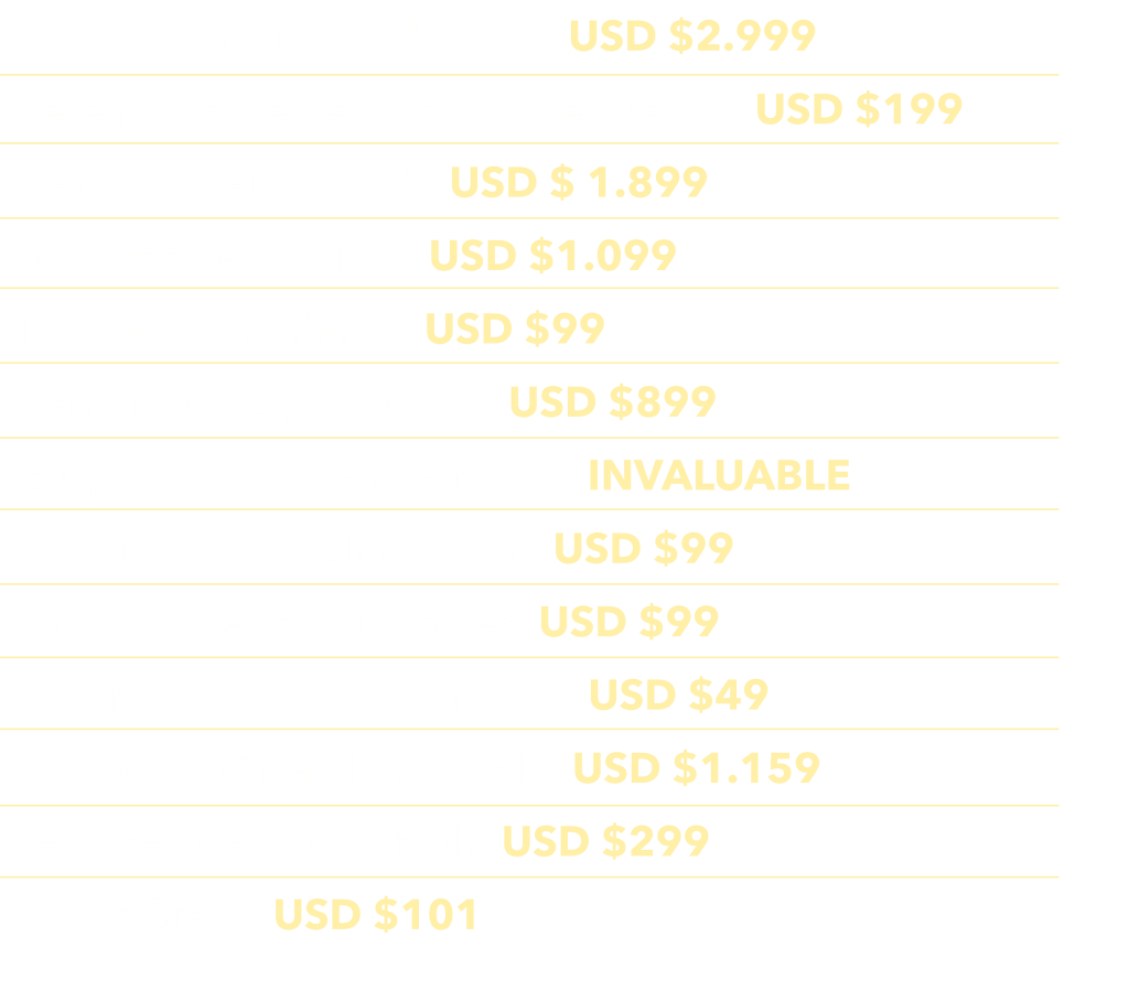 La inversión en tu crecimiento personal y espiritual es una de las más valiosas que puedes hacer. Los resultados de Manifestación Efectiva duran toda la vida.